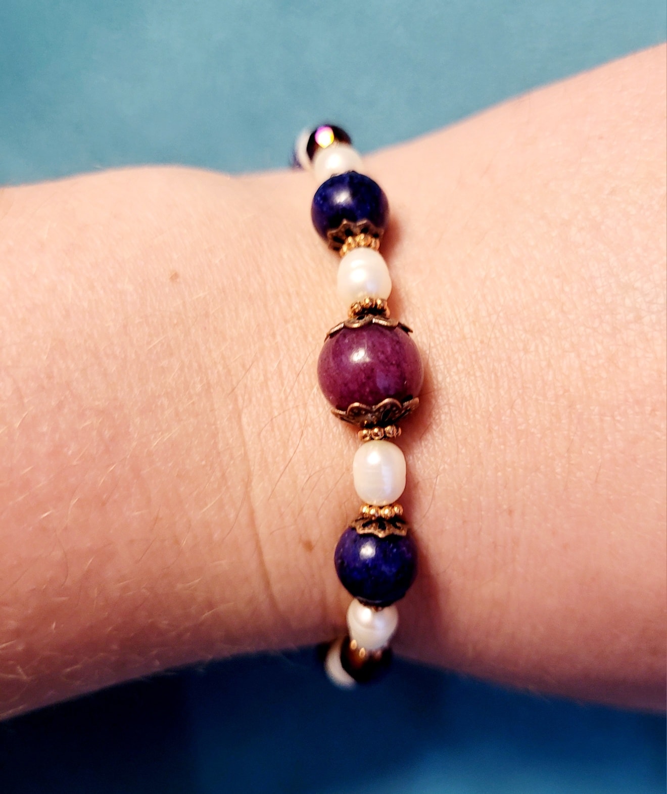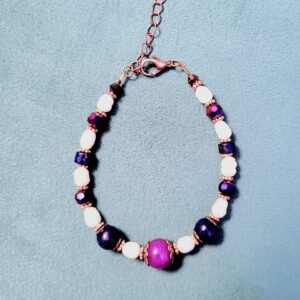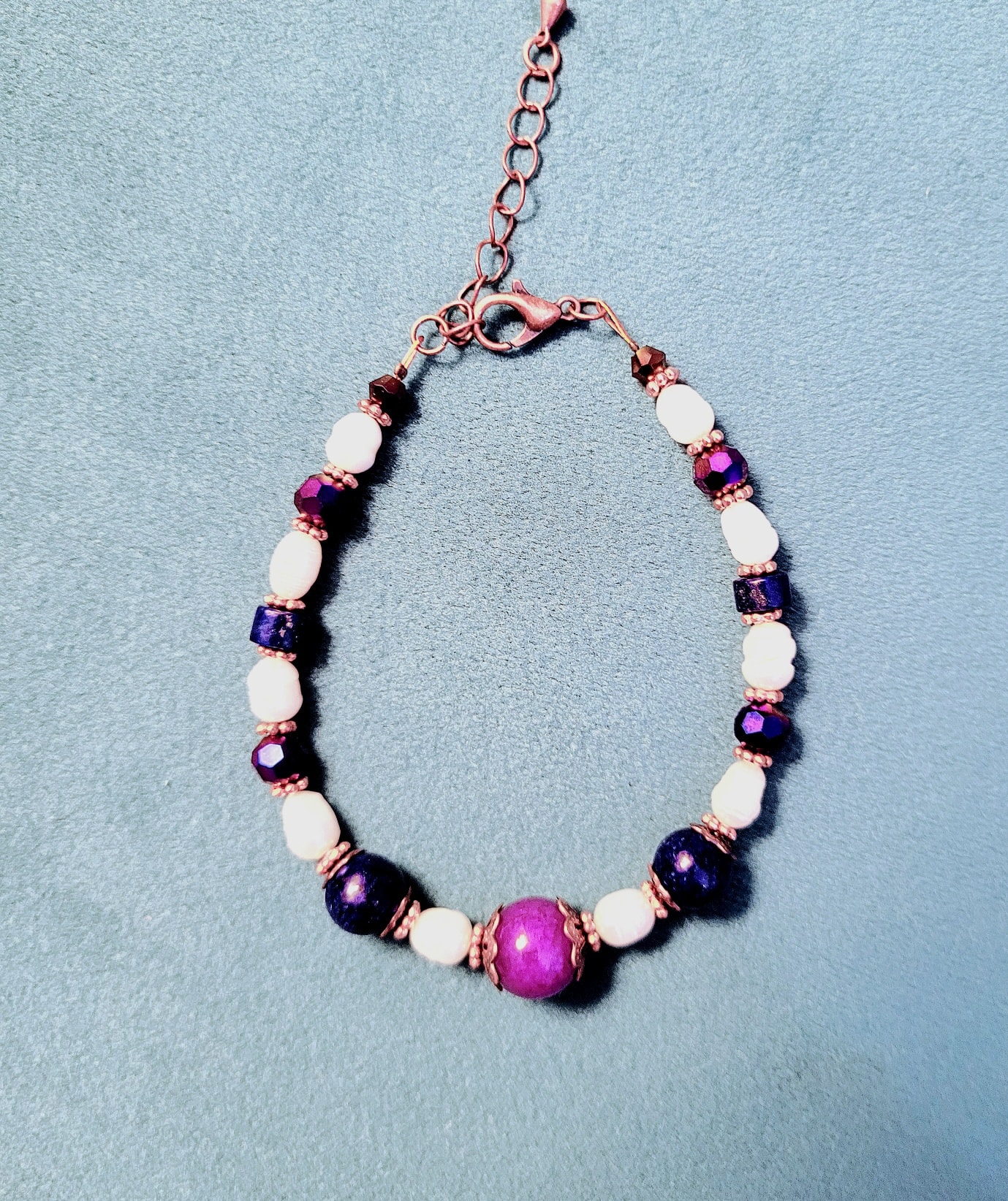 Purple and blue hues of natural stone combine with cultured freshwater pearls and antique copper plated accents in this elegant bracelet.